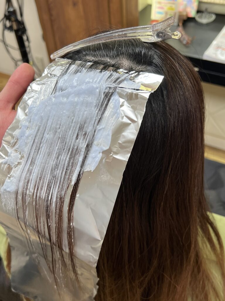 画像の様に前回の染め方が暗い白髪染めをしている方はその暗い部分を明るくする必要があります。